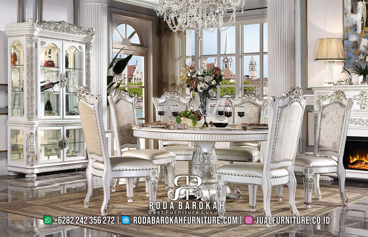 Desain Meja Makan Mewah Klasik RB1007 hadir dengan kaki ukiran klasik dan kain bludru putih, sempurna untuk menyempurnakan suasana elegan di ruang makan Anda.