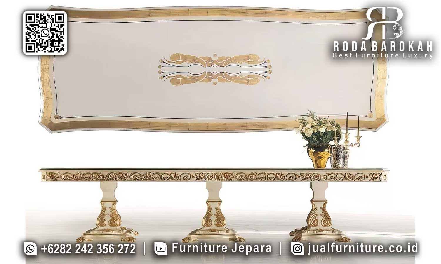 Favorit Meja Makan Mewah Gold menawarkan elegan klasik modern dengan kaki pilar ukiran kayu jati dan finishing cat duco gold, sempurna untuk ruang makan Anda.