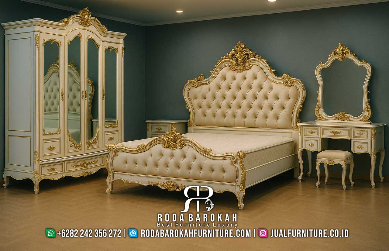 Kamar Tidur Mewah Gold dengan kayu jati dan ukiran emas, menghadirkan nuansa elegan dan fungsional dengan lemari pakaian serta meja rias dalam satu set.
