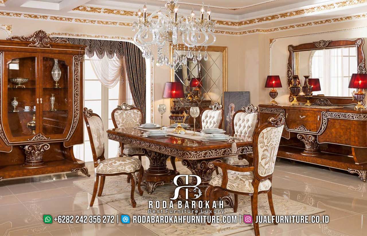 Produk ini tidak hanya memancarkan kemewahan visual, tetapi juga menawarkan kenyamanan maksimal melalui kursi yang didesain ergonomis. Di samping itu, detail pahat ukiran menambah nilai seni dan keunikan setiap bagian dari meja makan ini. Sebagai hasilnya, ruang makan Anda akan tampak istimewa dan penuh nuansa klasik yang memancarkan keanggunan.
