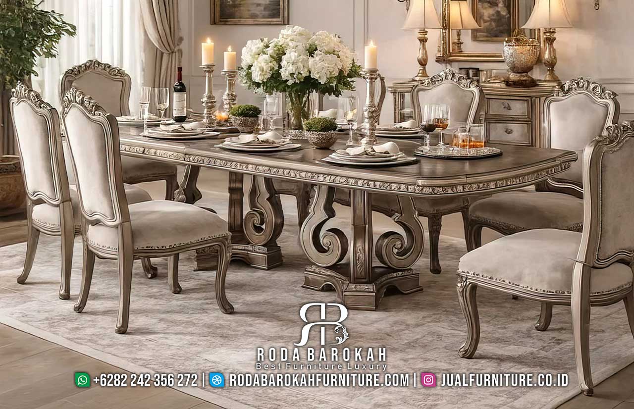 Dengan warna Silver Grey yang elegan, meja makan ini memancarkan kemewahan yang sulit ditolak. Penggunaan material Kayu Jati yang berkualitas menjadikannya tahan lama, bahkan untuk penggunaan sehari-hari. Di samping itu, ornamen ukiran yang detail menambah nilai estetika, menjadikan setiap sudut meja semakin menarik perhatian.