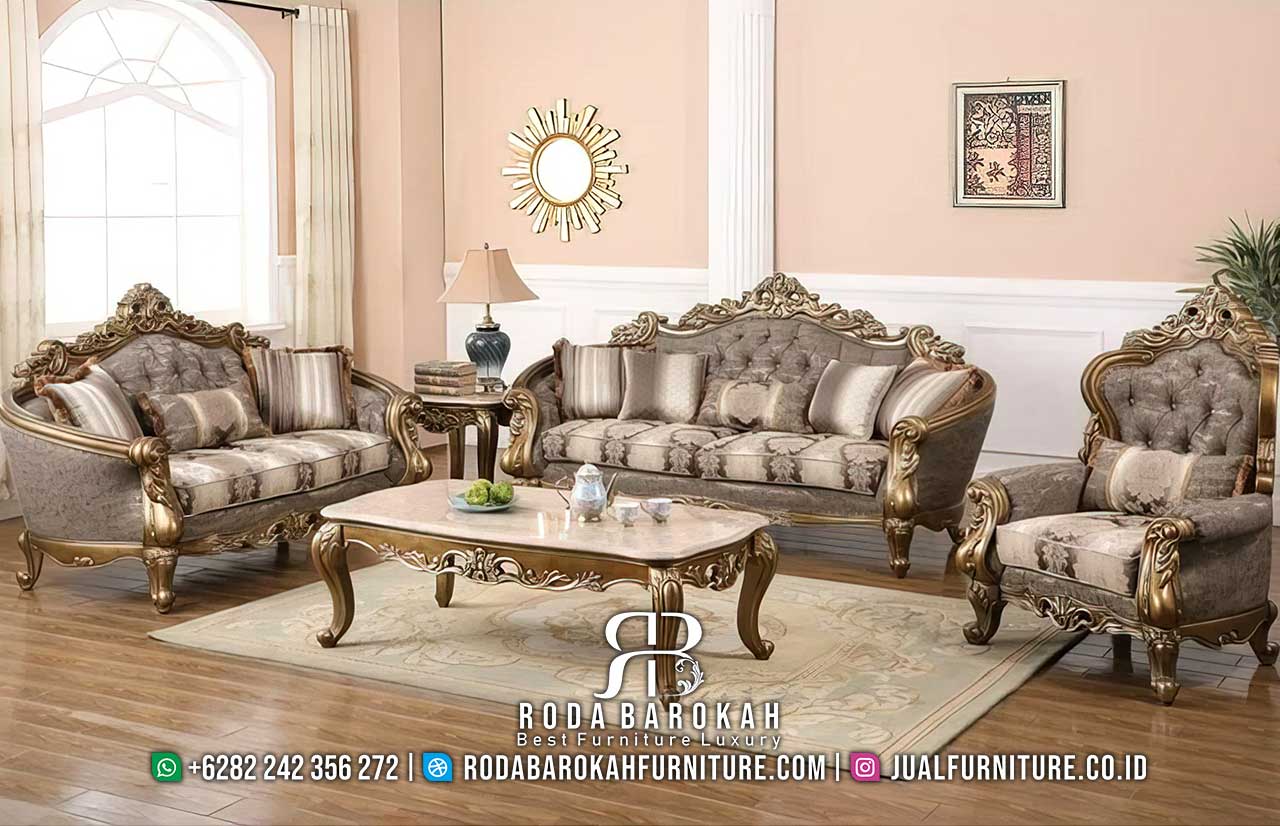 Order Sofa Tamu Mewah Klasik Siap Kirim RB-973 dengan rangka kayu jati dan finishing gold doff, menghadirkan nuansa elegan untuk ruang tamu Anda.