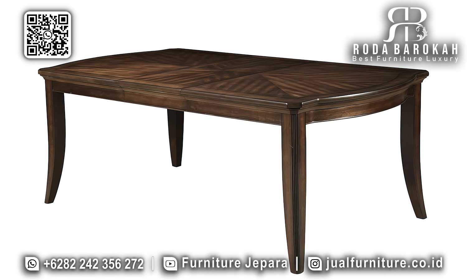Promo Meja Makan Jati Minimalis Nyaman Dipakai RB-957, terbuat dari kayu jati dengan kaki berukir dan kain bludru elegan, cocok untuk dekorasi minimalis modern.