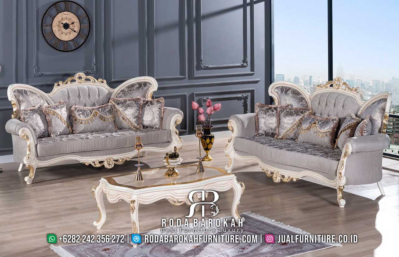 Bayangkan sebuah ruang tamu yang penuh gaya, di mana set kursi tamu mewah ini berfungsi sebagai titik fokusnya. Selain itu, keindahan desain klasik Eropa dengan warna abu-abu dan putih gold menciptakan nuansa mewah dan elegan. Dengan fitur sandaran tinggi dan pilar ukiran, set ini tidak hanya menarik secara visual tetapi juga memberikan kenyamanan maksimal bagi Anda dan tamu.