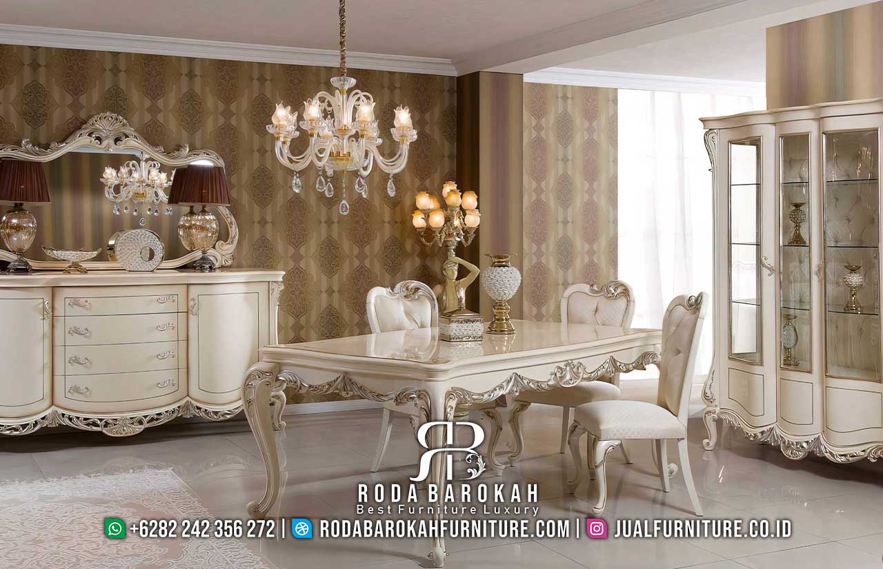 Sale Set Meja Makan Mewah Bisa Custom RB-921, terbuat dari kayu jati dengan cat duco putih dan desain ukiran elegan, sempurna untuk menyajikan hidangan formal.