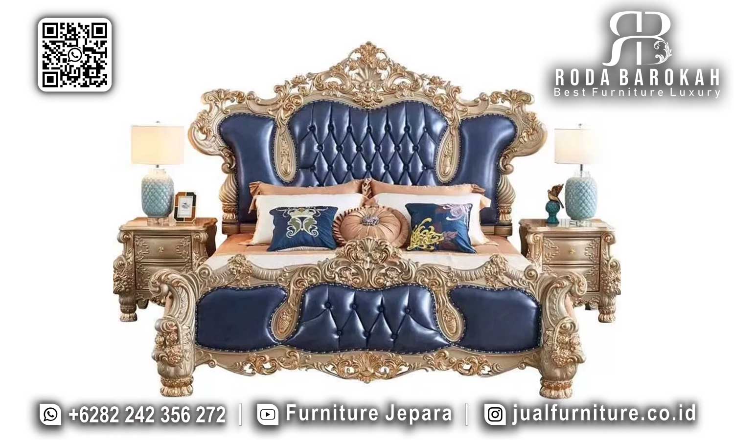 Serbu Sekarang Set Kamar Tidur Mewah dengan kayu jati lapis lac emas dan ukiran klasik Eropa yang membuat ruangan Anda terlihat lebih elegan dan mewah.