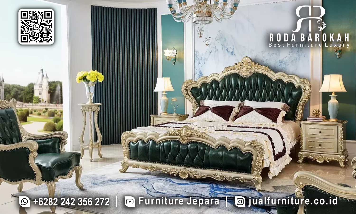 Menciptakan suasana yang berbeda, set kamar tidur mewah ini menghadirkan desain yang timeless sekaligus penuh detail artistik. Selain itu, keindahan ukiran emas menambah sentuhan kemewahan yang tak tertandingi, membuat ruang tidur Anda benar-benar istimewa. Dengan gaya klasik warna hijau dan emas, produk ini memancarkan keanggunan yang memukau.