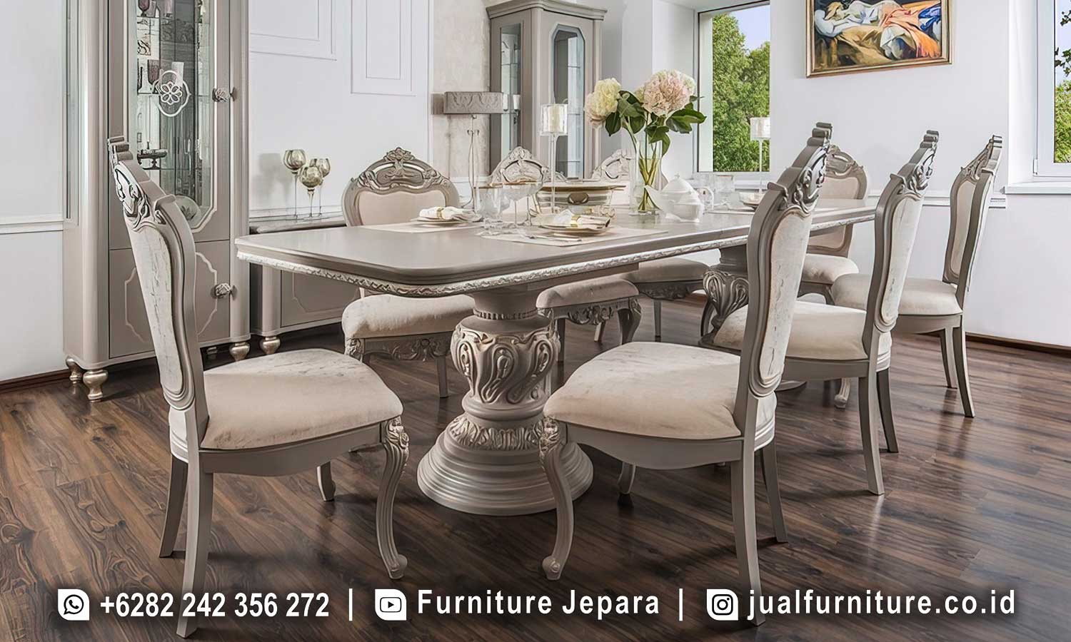 Dengan desain yang menggabungkan gaya klasik dan modern, set meja makan ini akan menjadi fokus utama saat berkumpul. Selain itu, pilar tengah yang terukir memberikan sentuhan artistik yang menawan, membuat pengalaman makan Anda semakin istimewa.