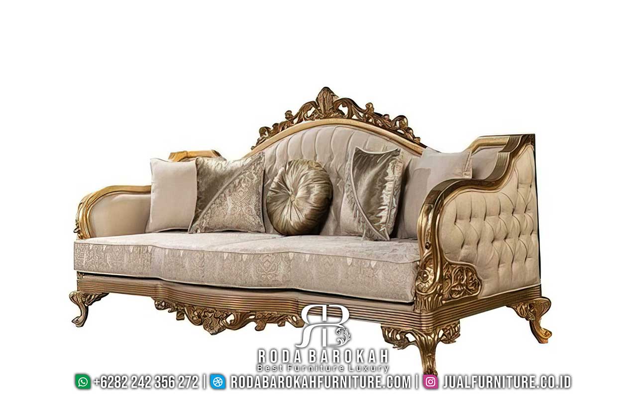 Terpercaya Sofa Tamu Mewah Banyak Dibeli RB-949 hadir dengan rangka kayu jati dan finishing gold doff, sempurna untuk nuansa klasik Eropa yang mewah di rumah Anda.