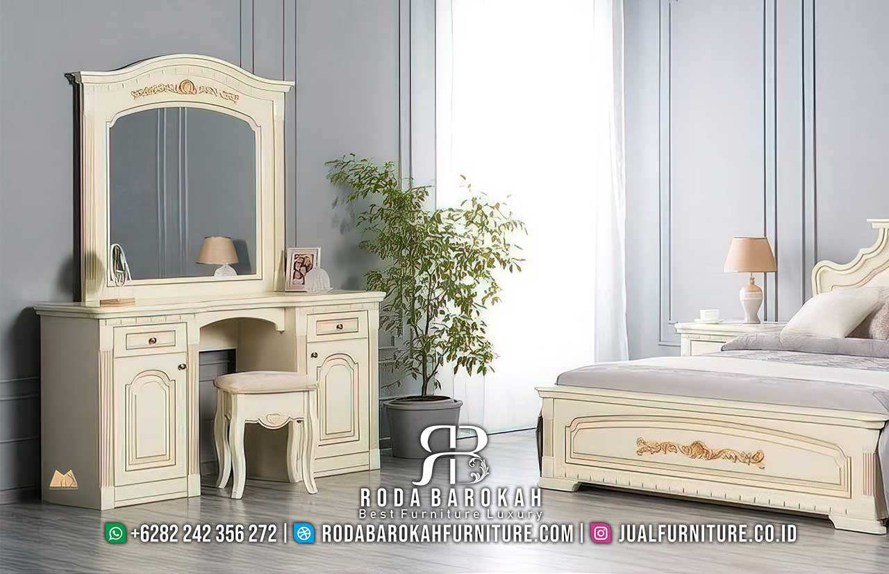 Tersedia Tempat Tidur Bellace Mewah dengan desain klasik modern, terbuat dari kayu jati dan cat duco krem, dilengkapi dua nakas dan busa empuk yang nyaman.