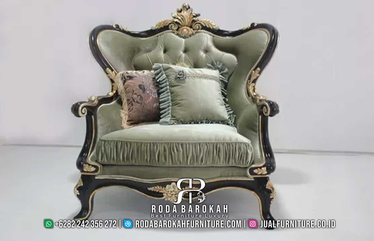 - Selanjutnya, desain sandaran tinggi dengan ukiran khas Eropa memberikan nuansa klasik yang berkelas. Di samping itu, jahitan timbul berbenang emas menambah detail artistik dan keindahan visualnya.